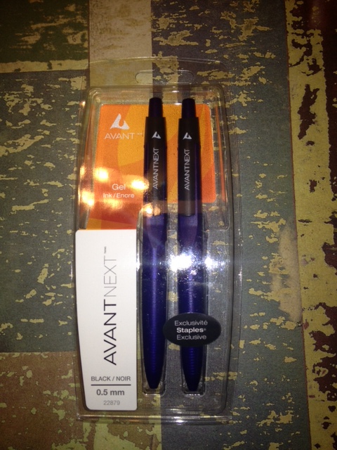 I picked up these pretty cobalt blue AvantNext Gel Ink pens this weekend while making a quick run to Staples. They just so happened to be on an end-display and caught my attention. Unfortunately, there wasn’t a price listed on them, so I had to wait until I got to the register to learn they were $4 (online they’re listed for $5.99 for a 2-pack, so perhaps this is an introductory price). A little bit of an inconvenience, but not a bad price. So I thought I’d give them a try.